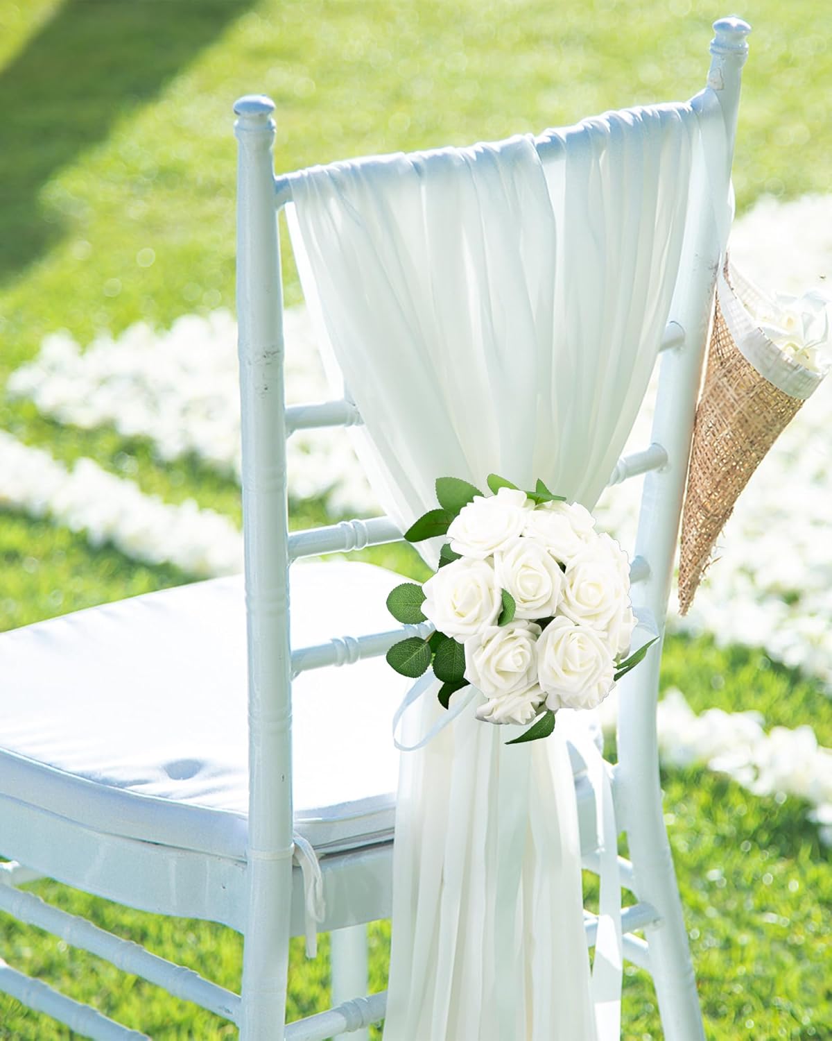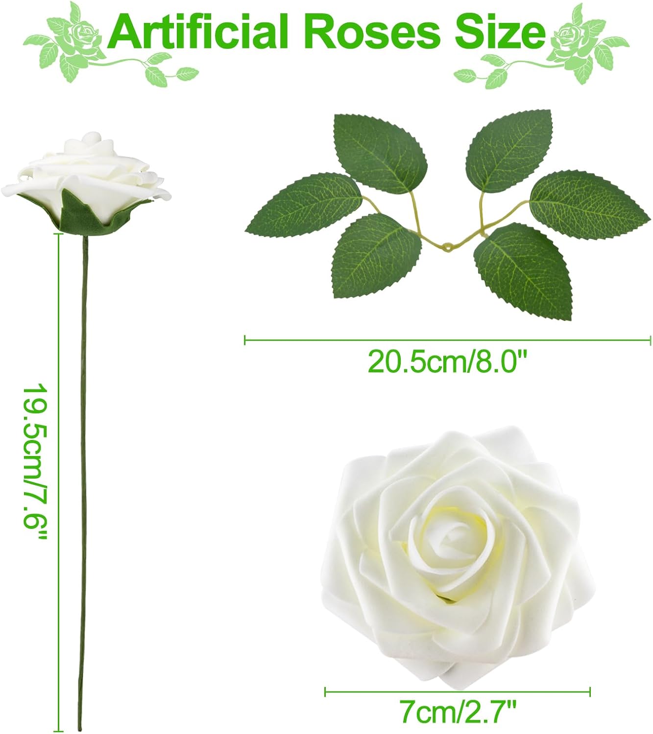• Artificial Roses Size: Box of 100 Pcs individual ivory white fake roses bulk (not a bunch of artificial flowers). Each faux rose head is approx 3 inch and with around 8" long stem. Each box has 20pcs green leaves for your decoration need